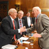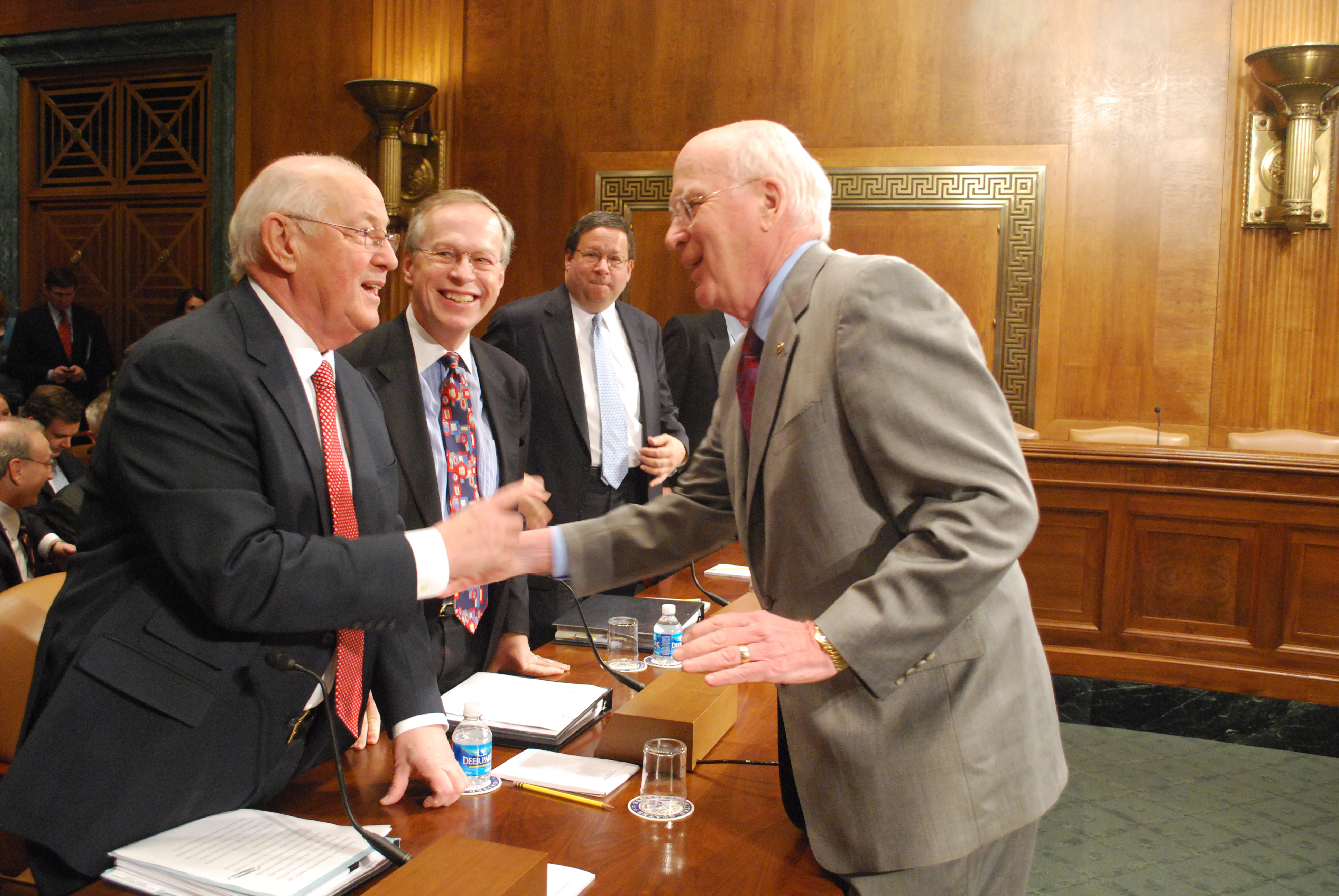 Senate Judiciary Committee Chairman Patrick Leahy (D-VT) greets Barrington Broadcasting Group CEO Jim Yager, then-Chairman of the NAB Television Board of Directors, prior to a hearing on satellite TV reauthorization. Standing to Yager's immediate left is CBS Executive Vice President Martin D. Franks, who also testified before the committee.