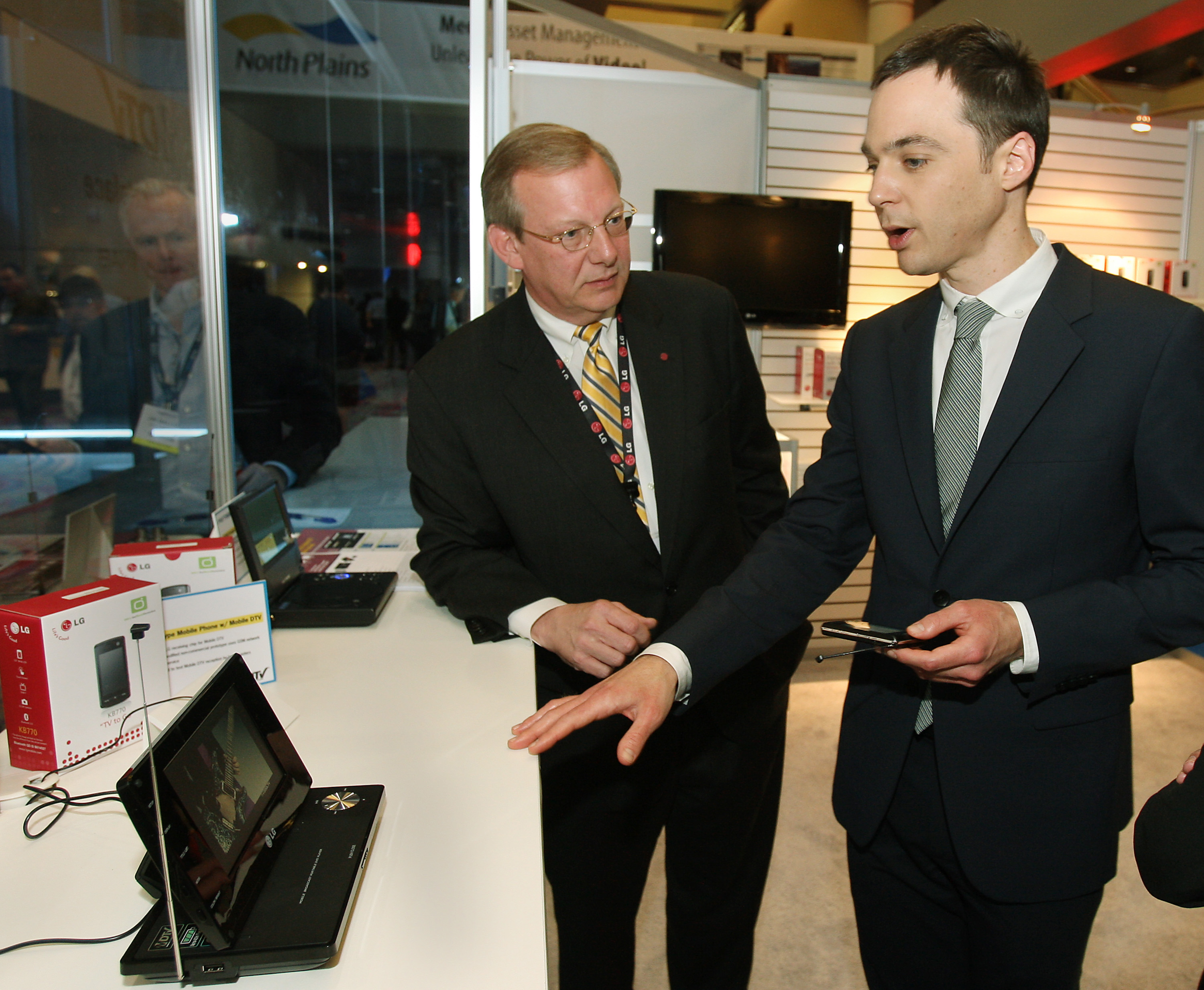 Actor Jim Parsons from CBS's "The Big Bang Theory" stops by the Mobile DTV Marketplace at the 2010 NAB Show to sample the latest mobile DTV technology on display. Also pictured is LG's John Taylor. (Photo credit: OMVC/LG)