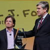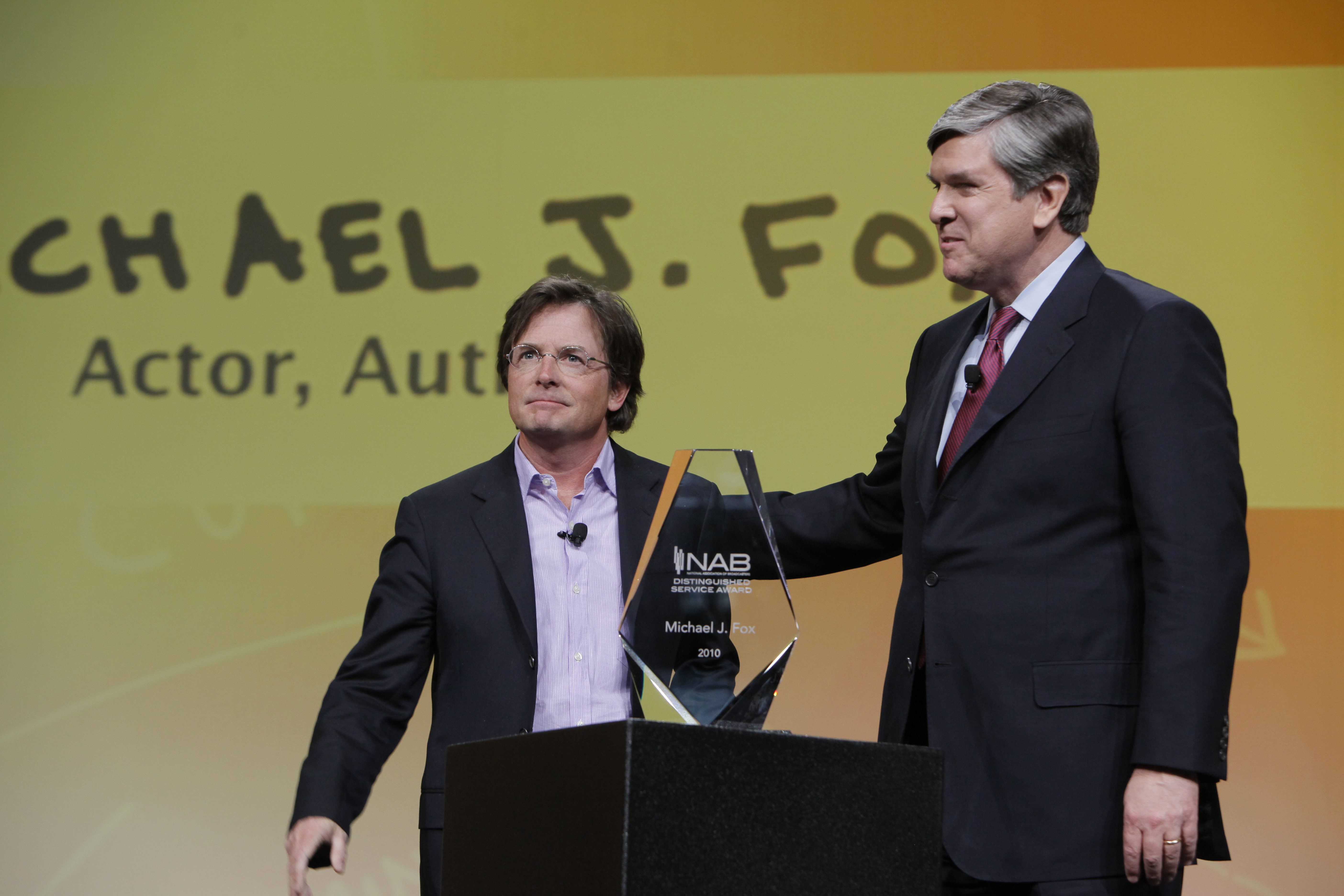 Actor and advocate Michael J. Fox is honored with NAB's highest honor, the Distinguished Service Award, during the 2010 NAB Show. Pictured is Fox (left) with NAB President and CEO Gordon Smith.