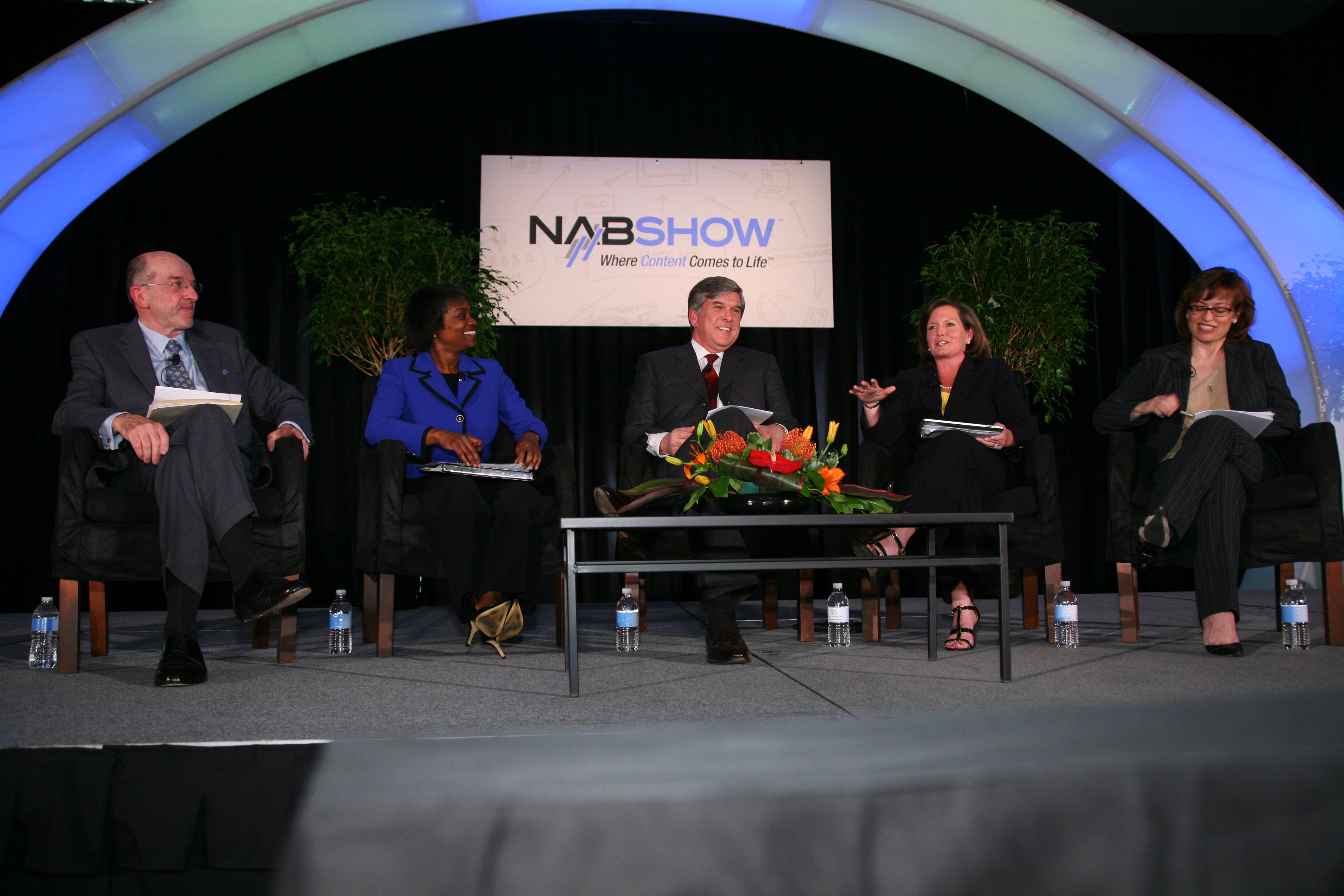 NAB President and CEO Gordon Smith discusses telecom policy issues with key regulators during the 2010 NAB Show. From Left to Right: Michael Copps, FCC; Mignon Clyburn, FCC; Gordon H. Smith, NAB; Meredith Attwell Baker, FCC; Anna Gomez, NTIA.