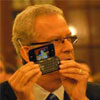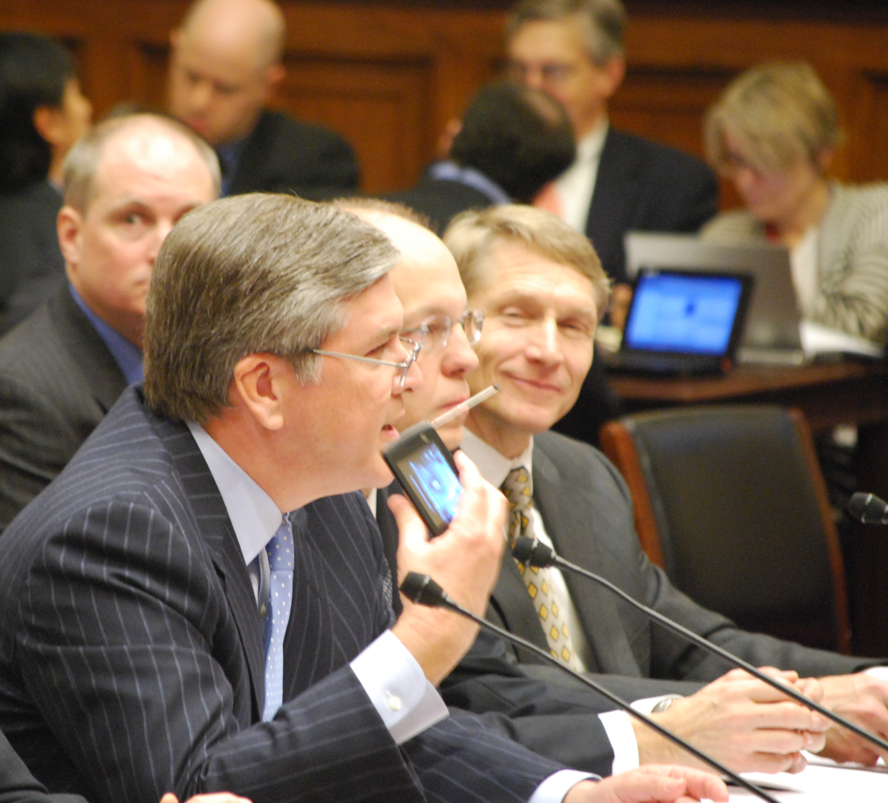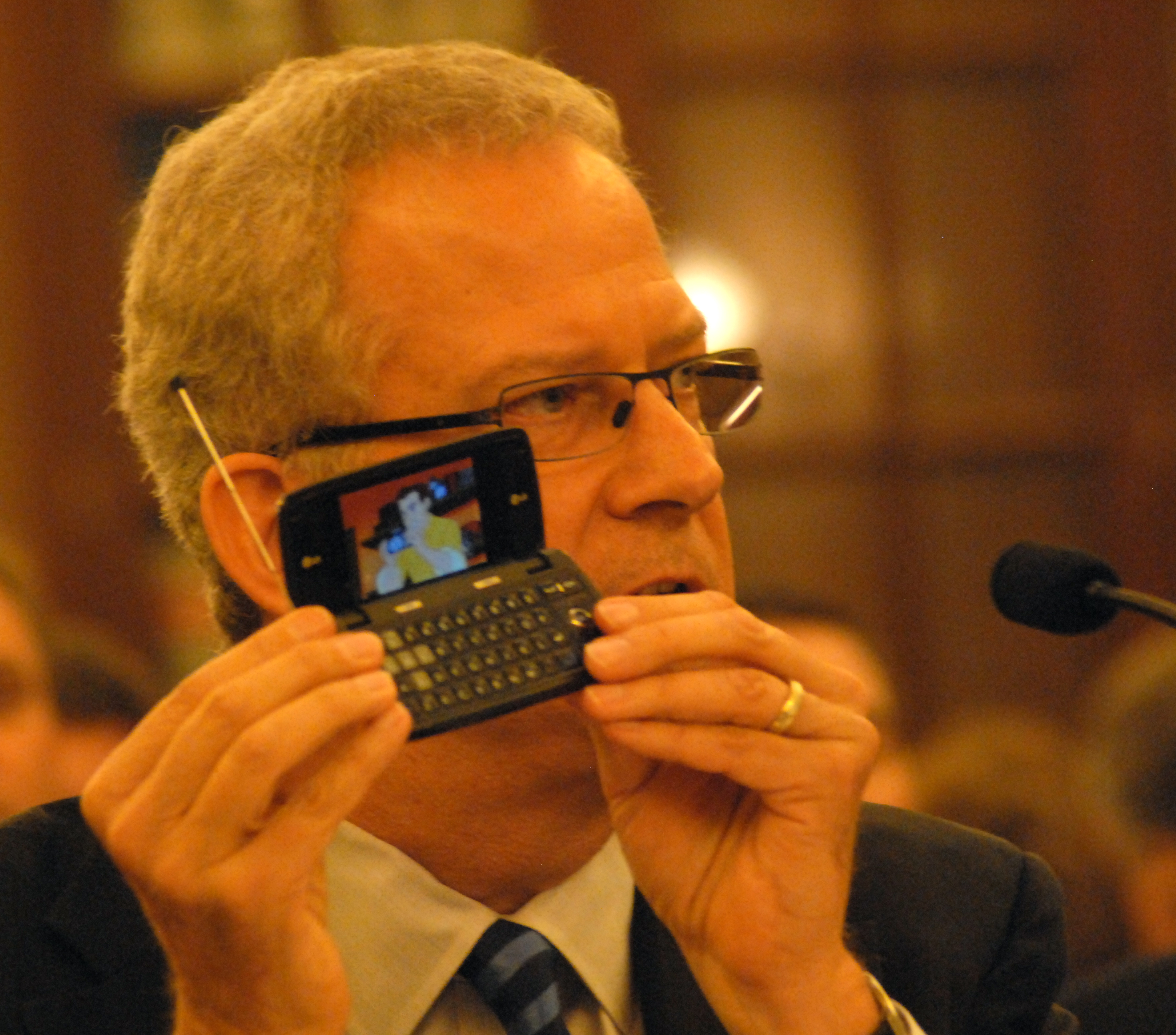 During a House Communications Subcommittee hearing on spectrum inventory legislation, NAB President and CEO Gordon Smith demonstrates a mobile DTV-capable cell phone.