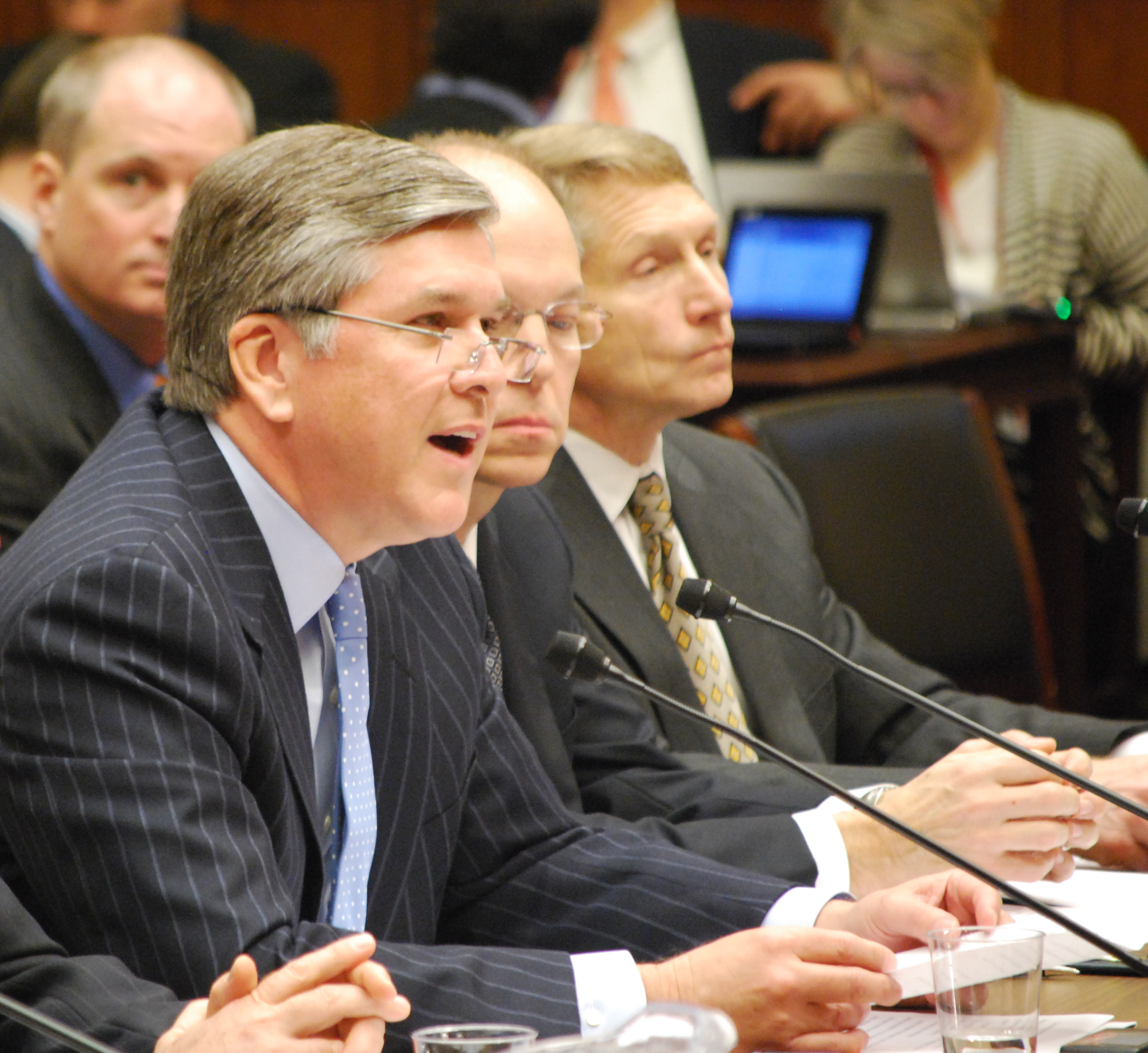 Hearst Television Inc. President and CEO David Barrett (center) delivers his opening statement at the House Subcommittee on Communications & Technology hearing on "The Future of Video" on June 27, 2012.
