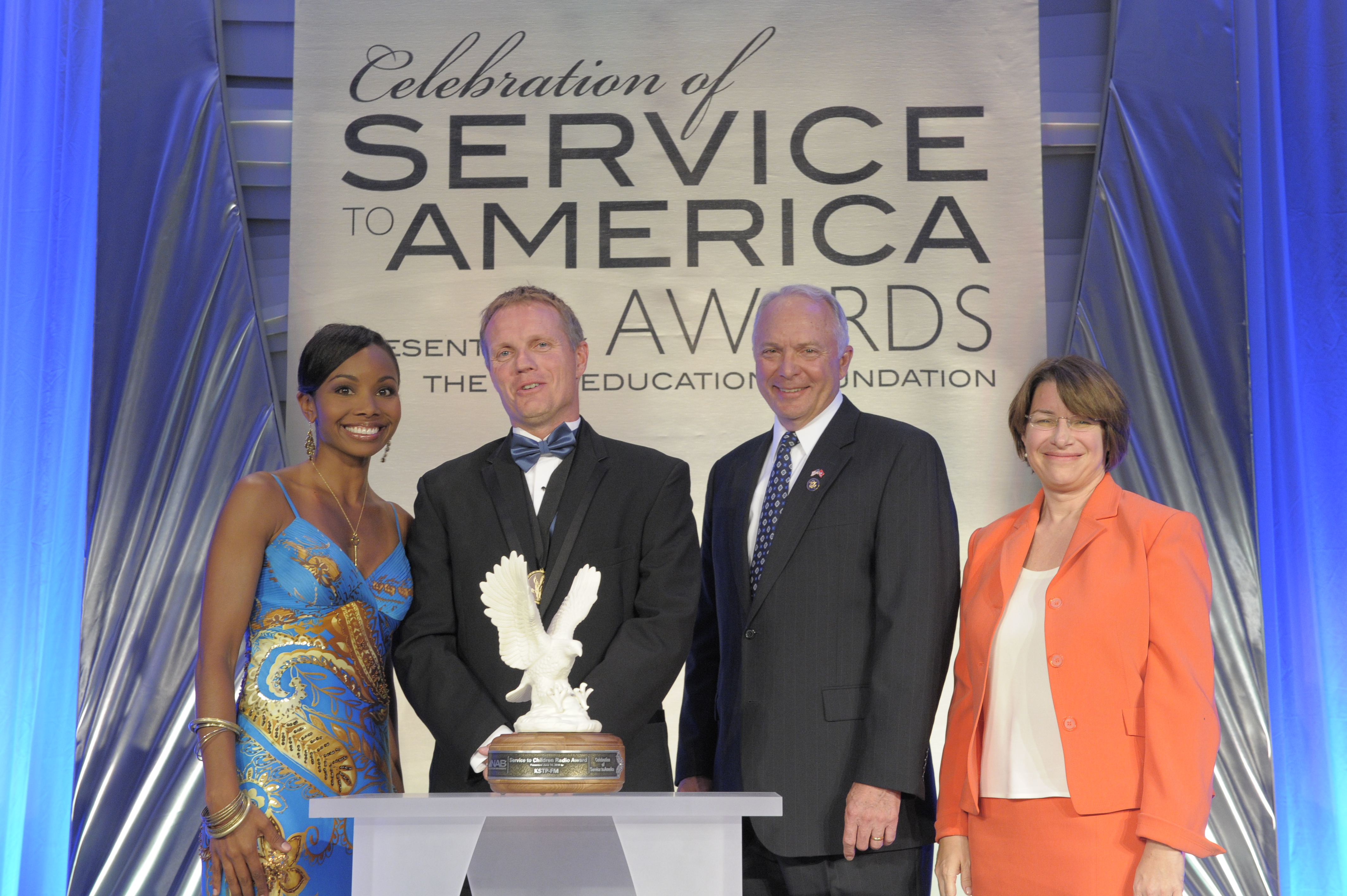 Sen. Amy Klobuchar (MN) (far right) and Rep. John Kline (MN-02) (second from right) presents an award to David Bestler (second from left), general manager of KSTP-FM Minneapolis, during the 2010 NAB Education Foundation's Celebration of Service to America Awards. The event honors radio and television broadcasters for their dedication to community service. Also pictured is Cynné Simpson, WJLA-TV Washington news anchor, who served as emcee for the evening.