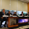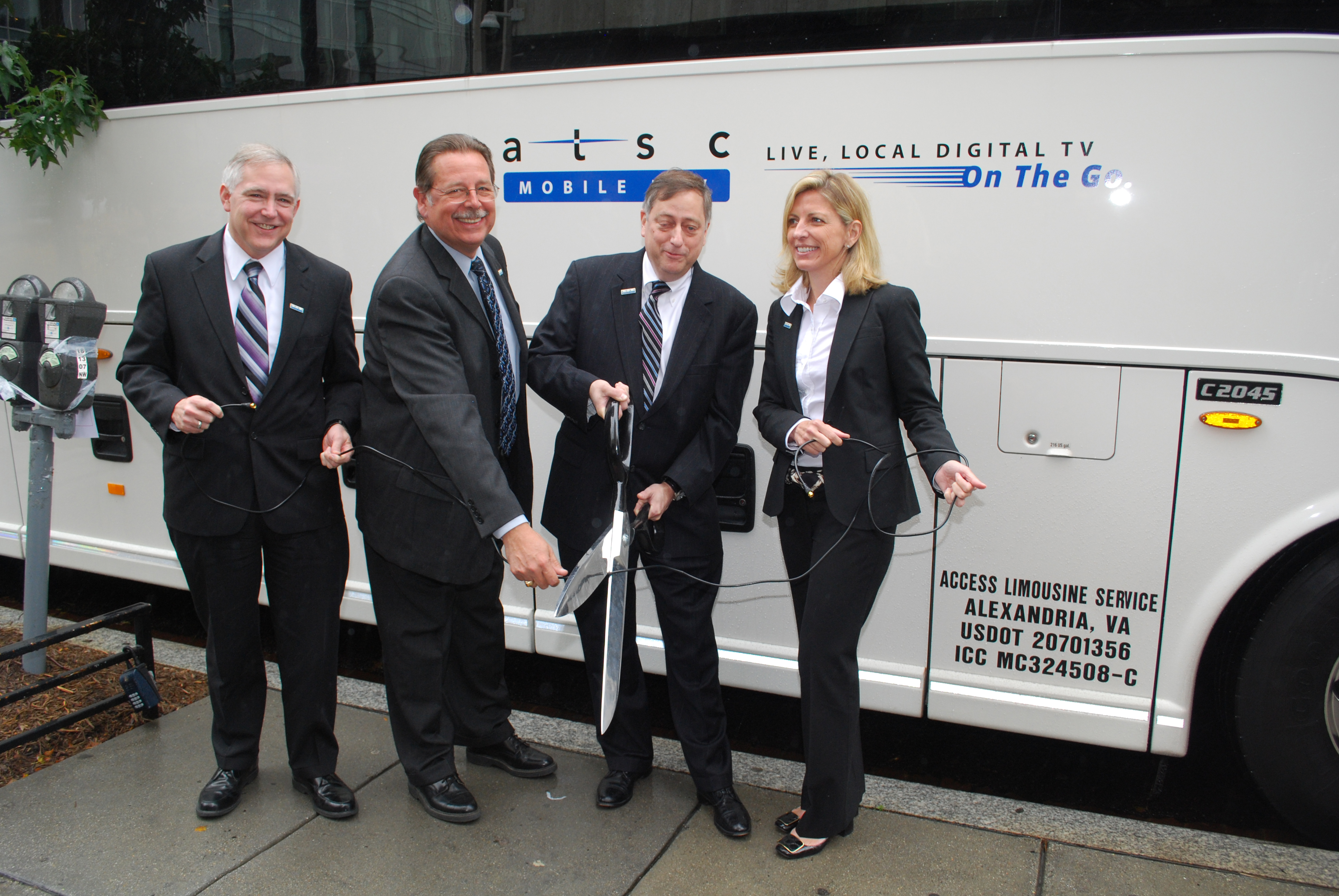 (L-R) NAB's Lynn Claudy, Sinclair Broadcasting's Mark Aitken, ATSC's Mark Richer and OMVC's Anne Schelle symbolically "cut the cord" during a mobile DTV demonstration in Washington, DC.