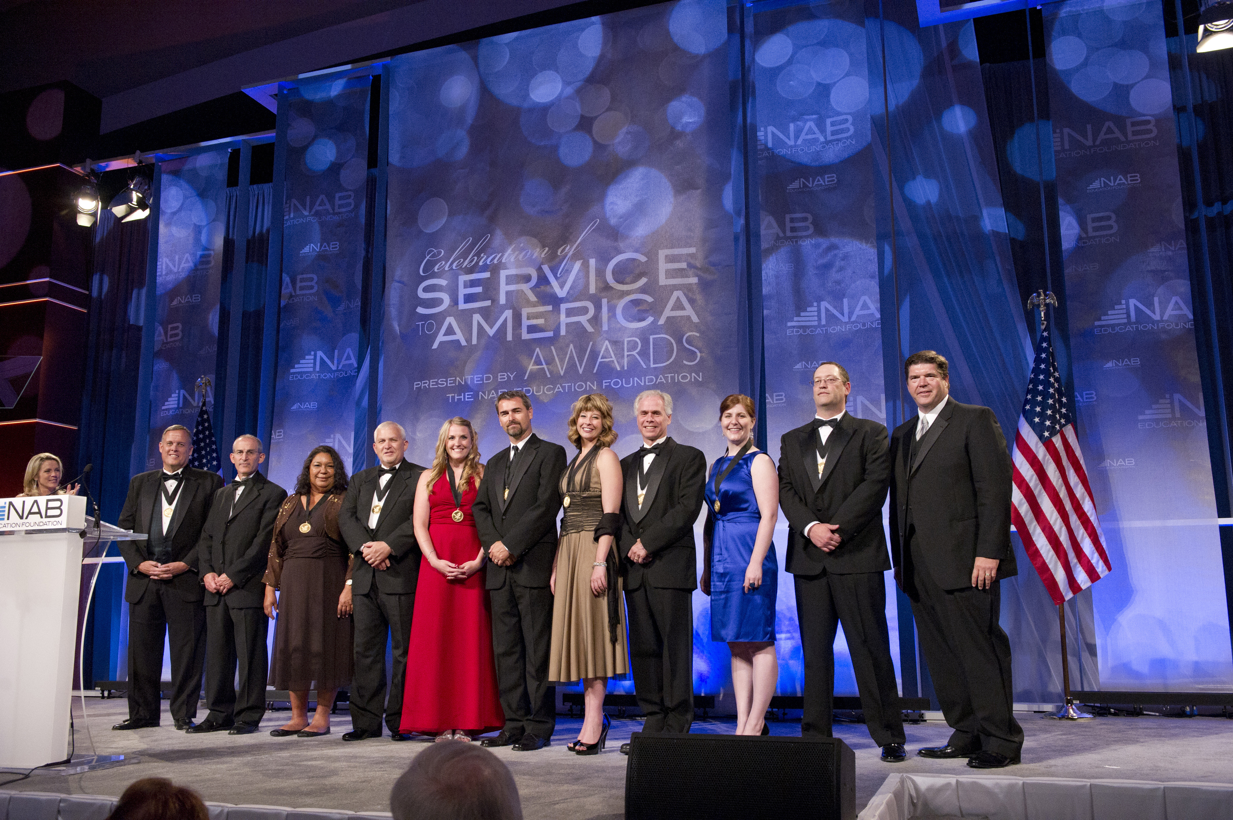 The 2012 Crystal Radio Award recipients are recognized onstage at the NAB Education Foundation's Celebration of Service to America Awards dinner on June 11, 2012.