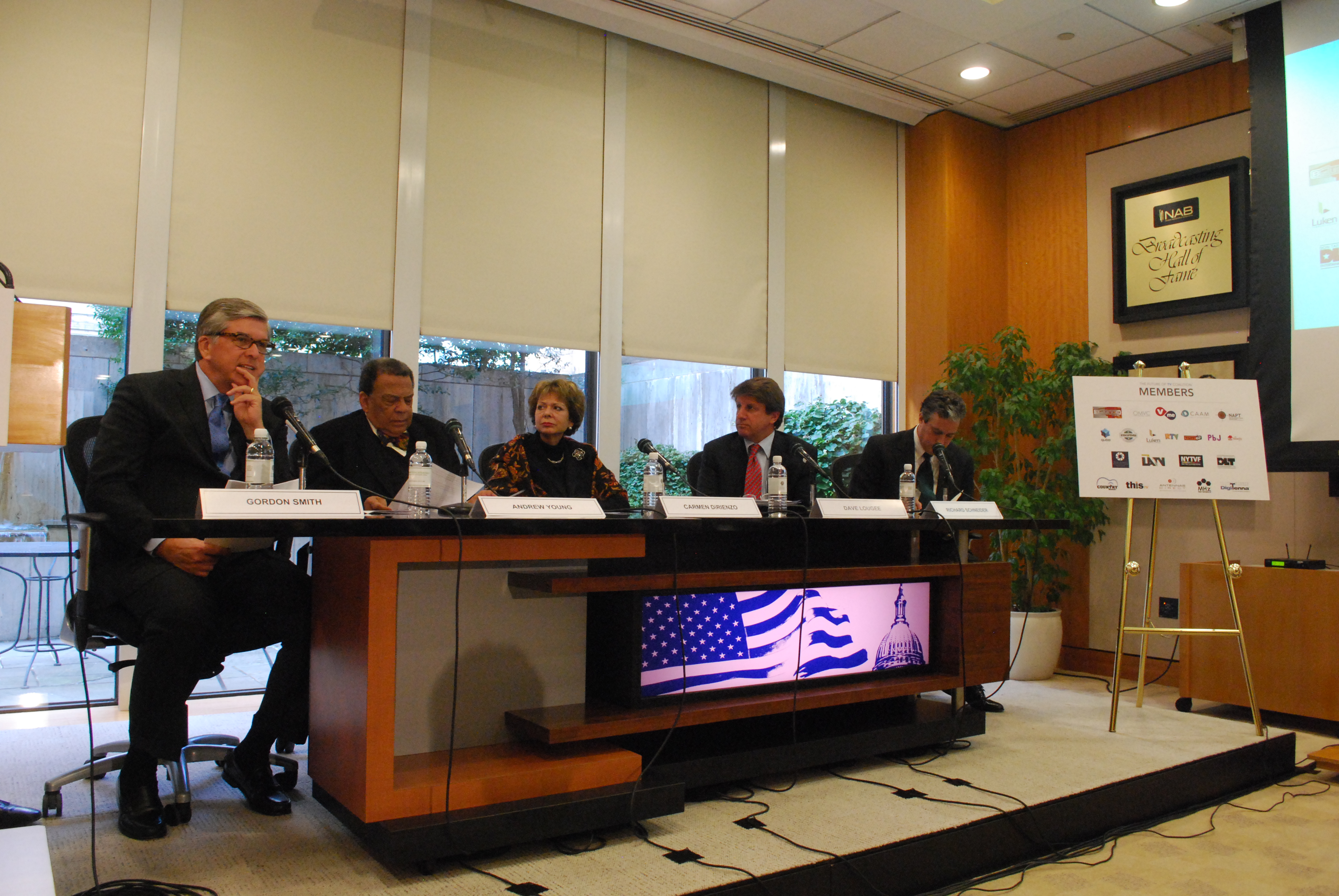 (L to R) NAB President and CEO Gordon Smith; Bounce TV co-founder and former U.N. Ambassador Andrew Young; Vme Founding President & CEO Carmen DiRienzo; Gannett Broadcasting President Dave Lougee; and President of Antennas Direct Richard Schneider at Future of TV Coalition launch Press Conference