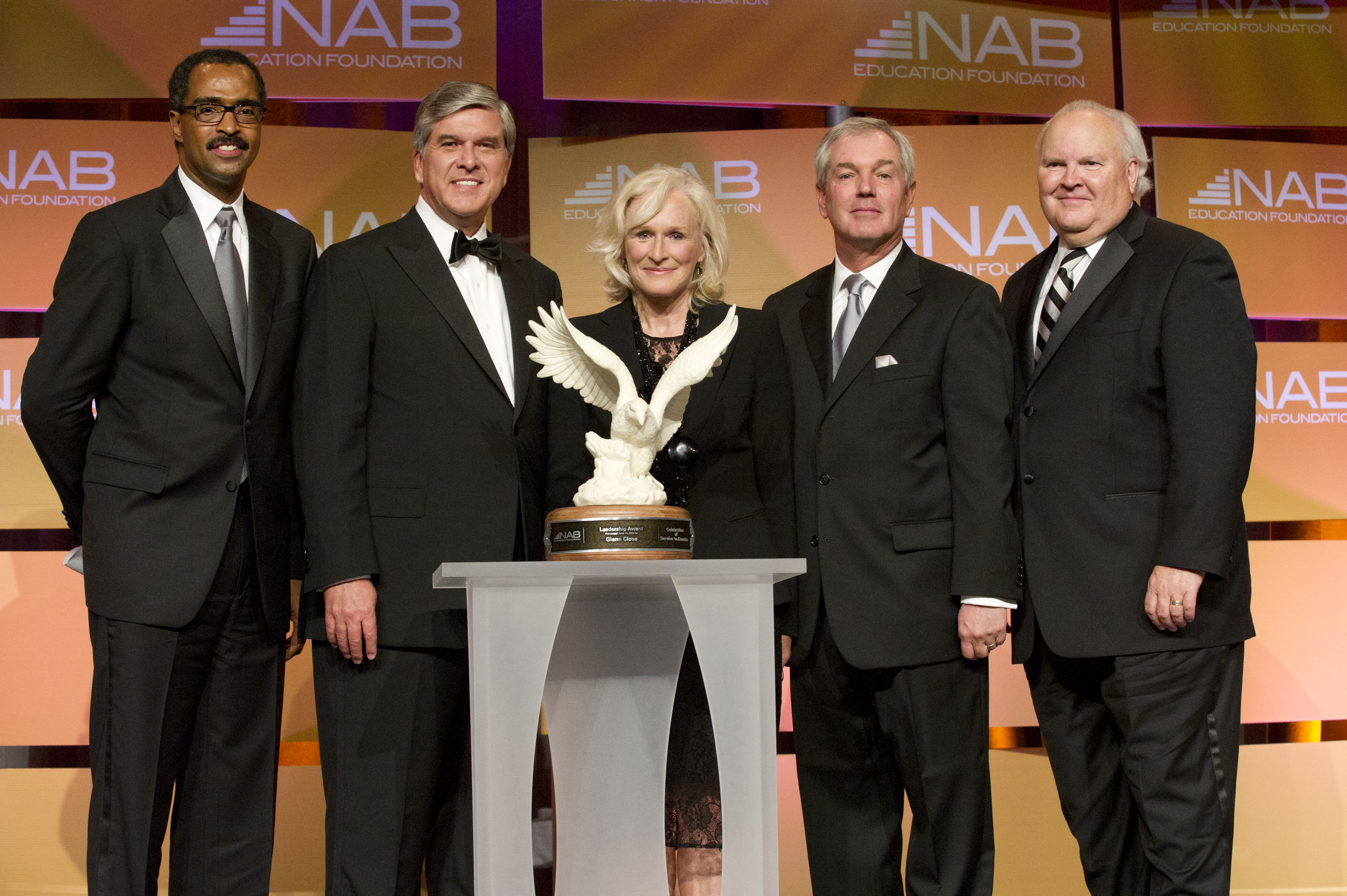 Glenn Close receives the Service to America Leadership Award at the NAB Education Foundation's Celebration of Service to America Awards dinner on June 11, 2012. From left to right: NAB Education Foundation President Marcellus Alexander, NAB President and CEO Gordon Smith, Close, President-Meredith Local Media Group Paul Karpowicz, and Hubbard Radio President and CEO Bruce Reese.