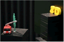 demonstration uses a small rotating model truck and other background